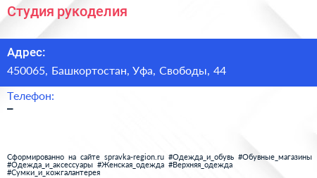 Студия рукоделия по адресу 450065, Башкортостан, Уфа, Свободы, 44 в дальнейшем Организация, размещена в следующих категориях: