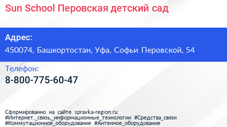 Sun School Перовская, детский сад по адресу 450074, Башкортостан, Уфа, Софьи Перовской, 54 в дальнейшем Организация, размещена в следующих категориях:
