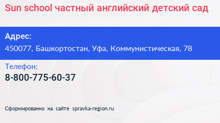 Sun school, частный английский детский сад по адресу 450077, Башкортостан, Уфа, Коммунистическая, 78 в дальнейшем Организация, размещена в следующих категориях: