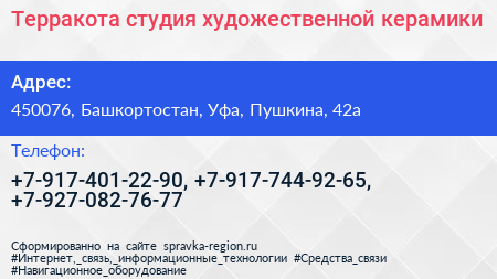 Терракота, студия художественной керамики по адресу 450076, Башкортостан, Уфа, Пушкина, 42а в дальнейшем Организация, размещена в следующих категориях: