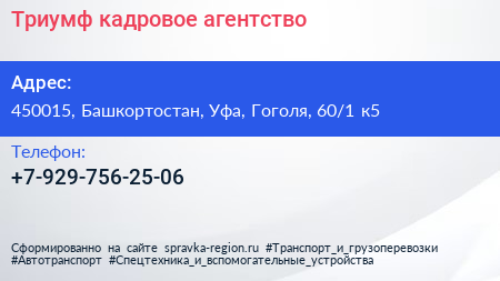 Триумф, кадровое агентство по адресу 450015, Башкортостан, Уфа, Гоголя, 60/1 к5 в дальнейшем Организация, размещена в следующих категориях: