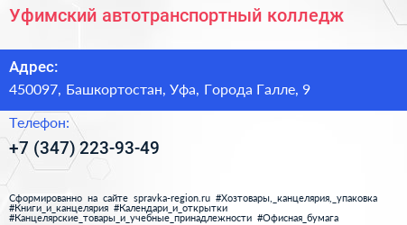 Уфимский автотранспортный колледж по адресу 450097, Башкортостан, Уфа, Города Галле, 9 в дальнейшем Организация, размещена в следующих категориях: