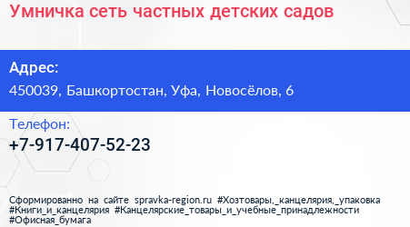 Умничка, сеть частных детских садов по адресу 450039, Башкортостан, Уфа, Новосёлов, 6 в дальнейшем Организация, размещена в следующих категориях: