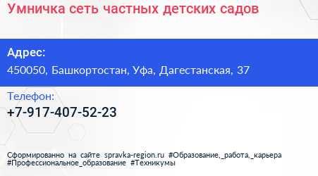 Умничка, сеть частных детских садов по адресу 450050, Башкортостан, Уфа, Дагестанская, 37 в дальнейшем Организация, размещена в следующих категориях: