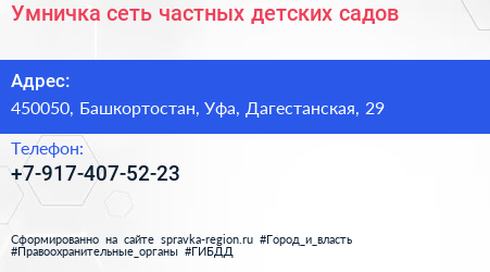 Умничка, сеть частных детских садов по адресу 450050, Башкортостан, Уфа, Дагестанская, 29 в дальнейшем Организация, размещена в следующих категориях: