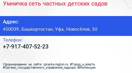 Умничка, сеть частных детских садов по адресу 450039, Башкортостан, Уфа, Новосёлов, 10 в дальнейшем Организация, размещена в следующих категориях:
