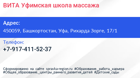 ВИТА, Уфимская школа массажа по адресу 450059, Башкортостан, Уфа, Рихарда Зорге, 17/1 в дальнейшем Организация, размещена в следующих категориях: