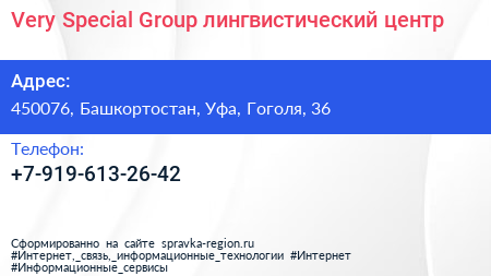 Very Special Group, лингвистический центр по адресу 450076, Башкортостан, Уфа, Гоголя, 36 в дальнейшем Организация, размещена в следующих категориях:
