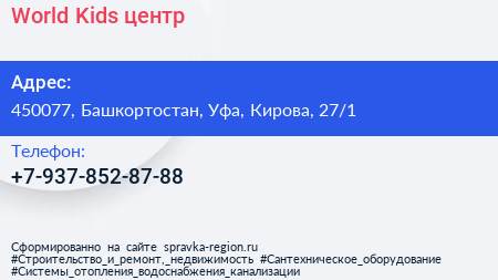 World Kids, центр по адресу 450077, Башкортостан, Уфа, Кирова, 27/1 в дальнейшем Организация, размещена в следующих категориях: