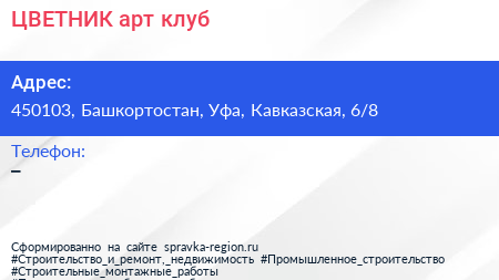 ЦВЕТНИК, арт-клуб по адресу 450103, Башкортостан, Уфа, Кавказская, 6/8 в дальнейшем Организация, размещена в следующих категориях: