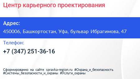 Центр карьерного проектирования по адресу 450006, Башкортостан, Уфа, бульвар Ибрагимова, 47 в дальнейшем Организация, размещена в следующих категориях:
