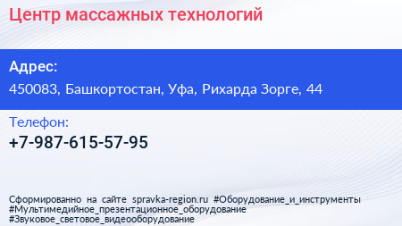 Центр массажных технологий по адресу 450083, Башкортостан, Уфа, Рихарда Зорге, 44 в дальнейшем Организация, размещена в следующих категориях: