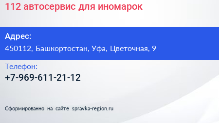 112, автосервис для иномарок по адресу 450112, Башкортостан, Уфа, Цветочная, 9 в дальнейшем Организация, размещена в следующих категориях: