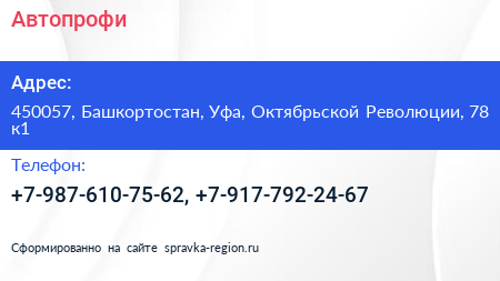 Автопрофи по адресу 450057, Башкортостан, Уфа, Октябрьской Революции, 78 к1 в дальнейшем Организация, размещена в следующих категориях: