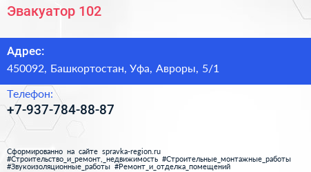 Эвакуатор 102 по адресу 450092, Башкортостан, Уфа, Авроры, 5/1 в дальнейшем Организация, размещена в следующих категориях: