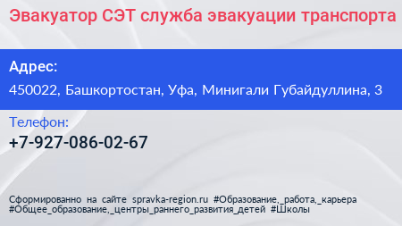 Эвакуатор СЭТ, служба эвакуации транспорта по адресу 450022, Башкортостан, Уфа, Минигали Губайдуллина, 3 в дальнейшем Организация, размещена в следующих категориях: