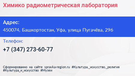 Химико-радиометрическая лаборатория по адресу 450074, Башкортостан, Уфа, улица Пугачёва, 296 в дальнейшем Организация, размещена в следующих категориях: