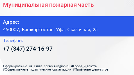 Муниципальная пожарная часть по адресу 450007, Башкортостан, Уфа, Сказочная, 2а в дальнейшем Организация, размещена в следующих категориях: