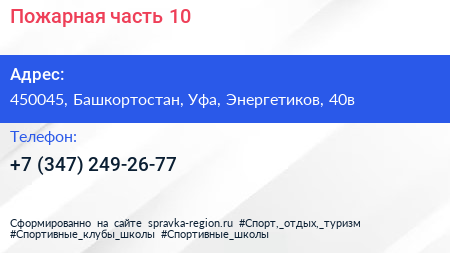 Пожарная часть №10 по адресу 450045, Башкортостан, Уфа, Энергетиков, 40в в дальнейшем Организация, размещена в следующих категориях: