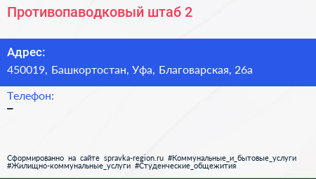 Противопаводковый штаб №2 по адресу 450019, Башкортостан, Уфа, Благоварская, 26а в дальнейшем Организация, размещена в следующих категориях: