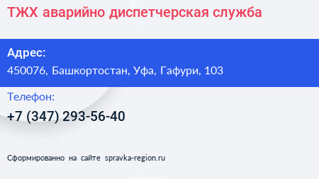 ТЖХ, аварийно-диспетчерская служба по адресу 450076, Башкортостан, Уфа, Гафури, 103 в дальнейшем Организация, размещена в следующих категориях: