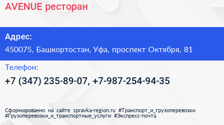 AVENUE, ресторан по адресу 450075, Башкортостан, Уфа, проспект Октября, 81 в дальнейшем Организация, размещена в следующих категориях: