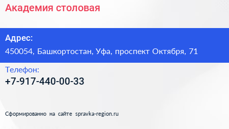 Академия, столовая по адресу 450054, Башкортостан, Уфа, проспект Октября, 71 в дальнейшем Организация, размещена в следующих категориях: