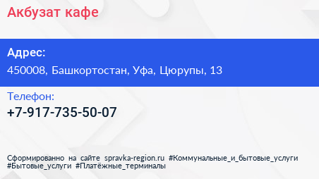 Акбузат, кафе по адресу 450008, Башкортостан, Уфа, Цюрупы, 13 в дальнейшем Организация, размещена в следующих категориях: