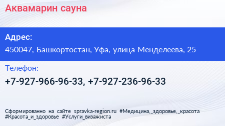 Аквамарин, сауна по адресу 450047, Башкортостан, Уфа, улица Менделеева, 25 в дальнейшем Организация, размещена в следующих категориях: