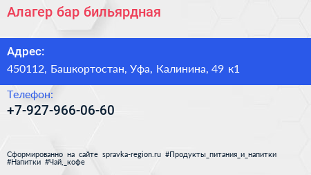 Алагер, бар-бильярдная по адресу 450112, Башкортостан, Уфа, Калинина, 49 к1 в дальнейшем Организация, размещена в следующих категориях: