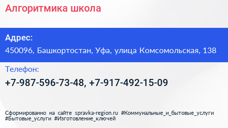 Алгоритмика, школа по адресу 450096, Башкортостан, Уфа, улица Комсомольская, 138 в дальнейшем Организация, размещена в следующих категориях: