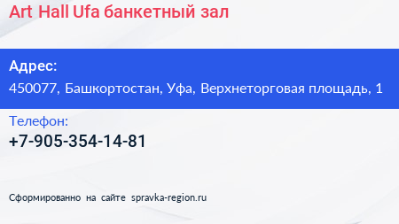 Art Hall Ufa, банкетный зал по адресу 450077, Башкортостан, Уфа, Верхнеторговая площадь, 1 в дальнейшем Организация, размещена в следующих категориях: