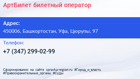 АртБилет, билетный оператор по адресу 450006, Башкортостан, Уфа, Цюрупы, 97 в дальнейшем Организация, размещена в следующих категориях: