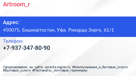 Artroom_r по адресу 450075, Башкортостан, Уфа, Рихарда Зорге, 61/1 в дальнейшем Организация, размещена в следующих категориях: