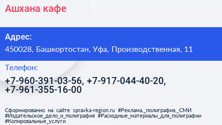 Ашхана, кафе по адресу 450028, Башкортостан, Уфа, Производственная, 11 в дальнейшем Организация, размещена в следующих категориях: