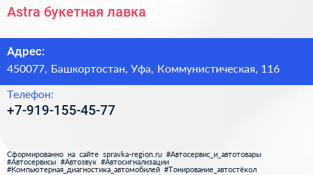 Astra, букетная лавка по адресу 450077, Башкортостан, Уфа, Коммунистическая, 116 в дальнейшем Организация, размещена в следующих категориях: