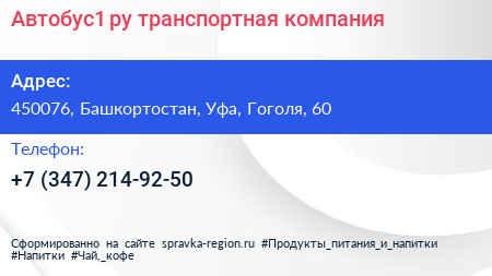 Автобус1.ру, транспортная компания по адресу 450076, Башкортостан, Уфа, Гоголя, 60 в дальнейшем Организация, размещена в следующих категориях: