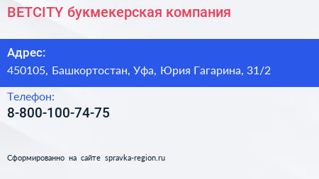 BETCITY, букмекерская компания по адресу 450105, Башкортостан, Уфа, Юрия Гагарина, 31/2 в дальнейшем Организация, размещена в следующих категориях: