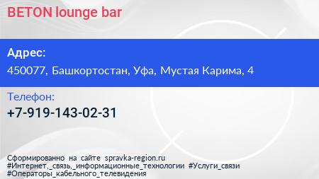 BETON lounge & bar по адресу 450077, Башкортостан, Уфа, Мустая Карима, 4 в дальнейшем Организация, размещена в следующих категориях: