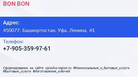 BON BON по адресу 450077, Башкортостан, Уфа, Ленина, 41 в дальнейшем Организация, размещена в следующих категориях: