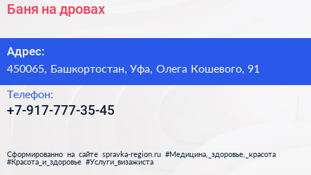 Баня на дровах по адресу 450065, Башкортостан, Уфа, Олега Кошевого, 91 в дальнейшем Организация, размещена в следующих категориях: