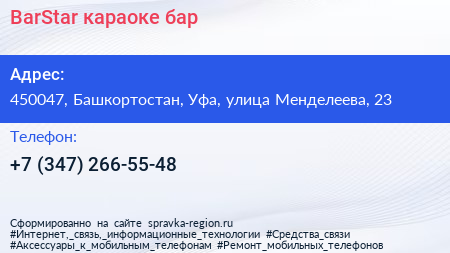 BarStar, караоке-бар по адресу 450047, Башкортостан, Уфа, улица Менделеева, 23 в дальнейшем Организация, размещена в следующих категориях: