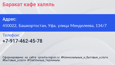 Баракат, кафе-халяль по адресу 450022, Башкортостан, Уфа, улица Менделеева, 134/7 в дальнейшем Организация, размещена в следующих категориях: