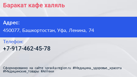 Баракат, кафе-халяль по адресу 450077, Башкортостан, Уфа, Ленина, 74 в дальнейшем Организация, размещена в следующих категориях: