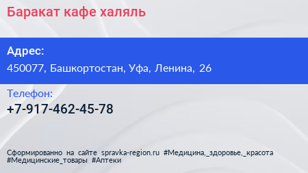 Баракат, кафе-халяль по адресу 450077, Башкортостан, Уфа, Ленина, 26 в дальнейшем Организация, размещена в следующих категориях:
