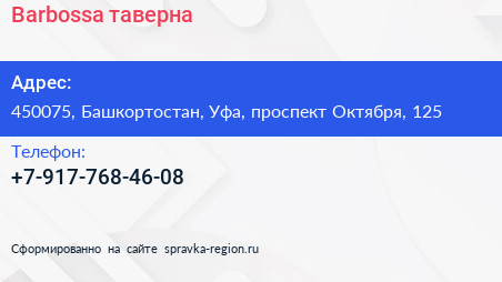 Barbossa, таверна по адресу 450075, Башкортостан, Уфа, проспект Октября, 125 в дальнейшем Организация, размещена в следующих категориях: