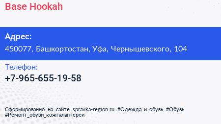 Base Hookah по адресу 450077, Башкортостан, Уфа, Чернышевского, 104 в дальнейшем Организация, размещена в следующих категориях: