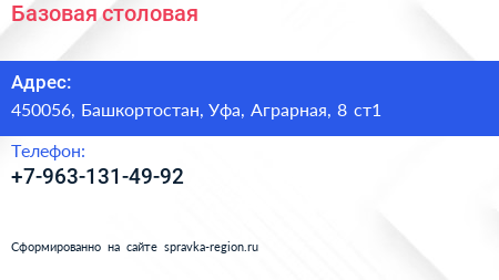 Базовая столовая по адресу 450056, Башкортостан, Уфа, Аграрная, 8 ст1 в дальнейшем Организация, размещена в следующих категориях: