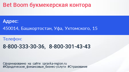 Bet Boom, букмекерская контора по адресу 450014, Башкортостан, Уфа, Ухтомского, 15 в дальнейшем Организация, размещена в следующих категориях: