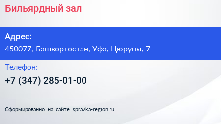 Бильярдный зал по адресу 450077, Башкортостан, Уфа, Цюрупы, 7 в дальнейшем Организация, размещена в следующих категориях: